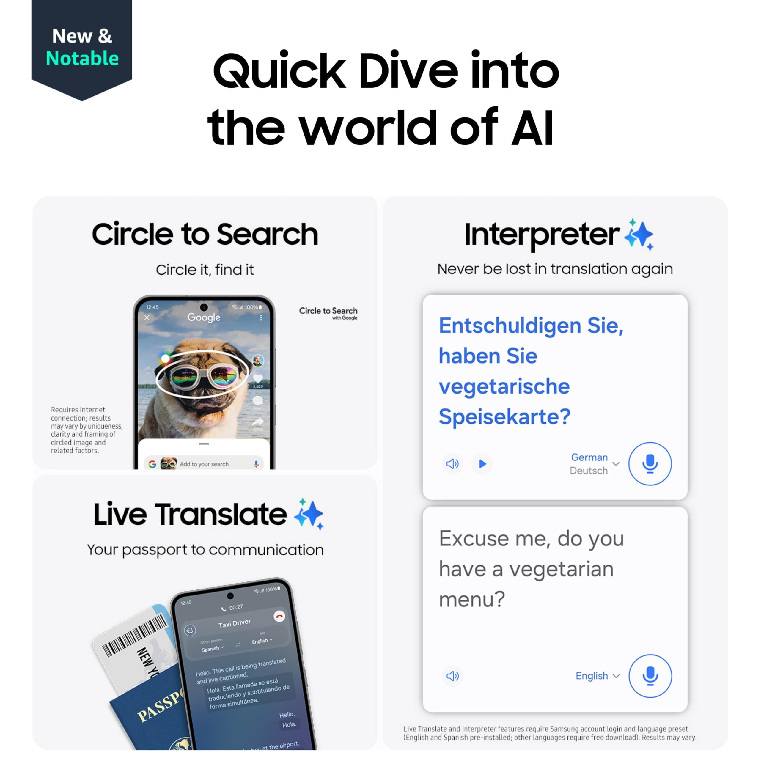 ¹Requires Samsung account login and internet connection. Editing with Generative Edit results in a resized photo up to 12MP. ²Galaxy AI features by Samsung will be provided for free until the end of 2025 on supported Samsung Galaxy devices. ³Instant Slow-Mo available only with videos saved in the Samsung gallery app, recorded at up to 4K@60fps (not available with HDR10+ videos). ⁴Based on average battery life under typical conditions. Average expected performance based on typical use. Actual battery life depends on factors such as network, features selected, frequency of calls and voice, data, and other application usage patterns. Results may vary. ⁵Requires Samsung account login and language preset (English and Spanish pre-installed; other languages require free download). Results may vary.⁶Products sold separately. ⁷Energy Score Insights track data and require compatible Galaxy AI phone, Samsung Health app, and Samsung account. ⁸Quick Share between Galaxy devices available with the following OS: smartphones and tablets with Android OS version 10.0 (Q) and One UI 2.1 or above, PCs running Windows 10 or later. Requires Samsung account, Wi-Fi and Bluetooth connections between devices. ⁹Requires internet connection; results may vary by uniqueness, clarity and framing of circled image and related factors.